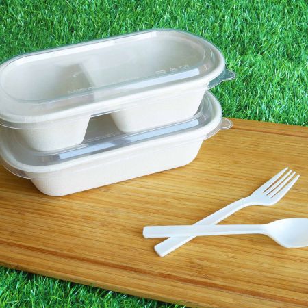 Contenitore per alimenti ovale in bagassa e coperchio trasparente (800 ml) - Scatola per pasti ovale in bagassa + coperchio trasparente, scatola per pranzo monouso in canna da zucchero + coperchio trasparente | Produttore di forchette e cucchiai compostabili Made in Taiwan | Tair Chu