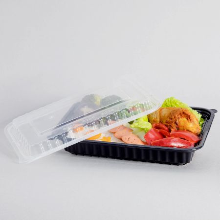 28oz長方形容器はPP素材で作られ、耐油性と耐熱性があり、840mlの長方形の電子レンジ対応容器は寿司、弁当、サラダなどの料理に適しており、透明な蓋で料理が一目でわかります!