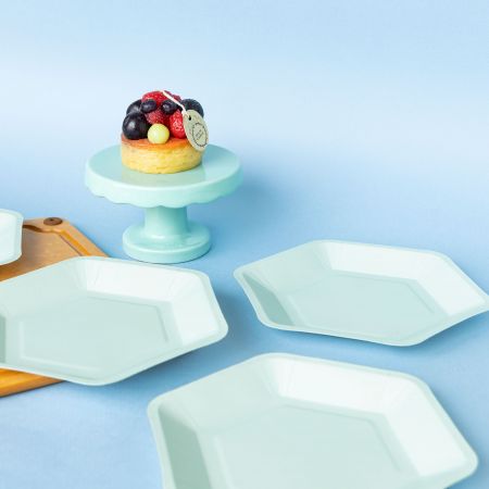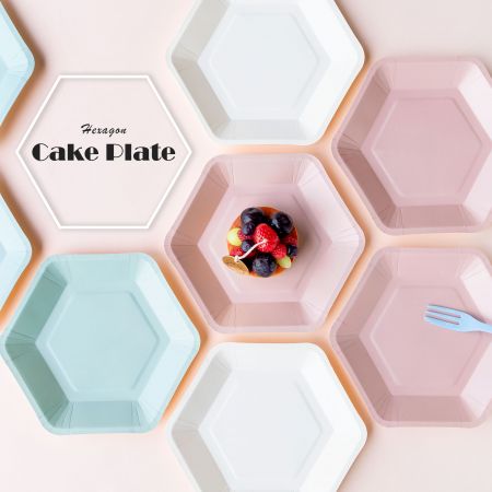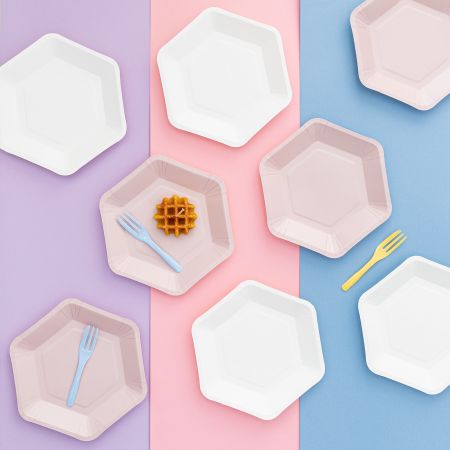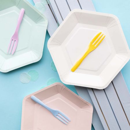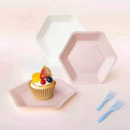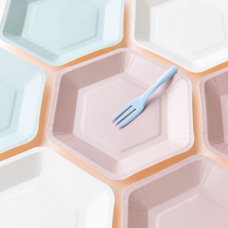- Conteúdo: 4 garfos de bolo + 4 pratos de papel em forma de hexágono