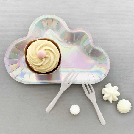 Prato e garfo de sobremesa iridescente em nuvem - Conjunto de Pratos Iridescentes em Formato de Nuvem para Festa no Céu | Fabricante de Garfos e Colheres Compostáveis Made in Taiwan | Tair Chu