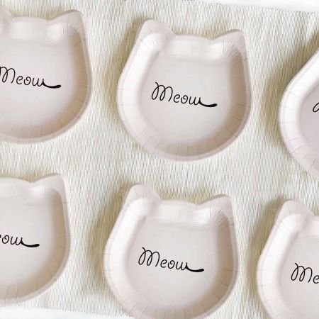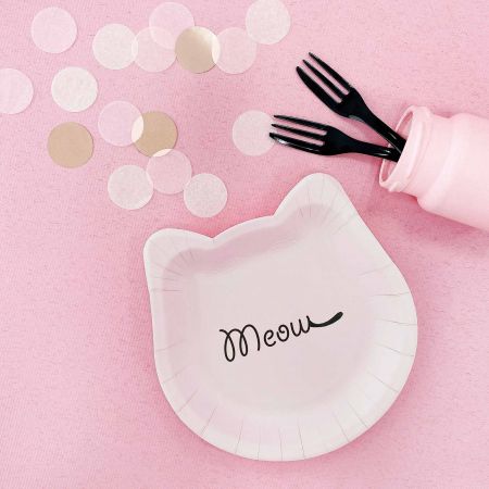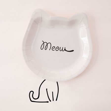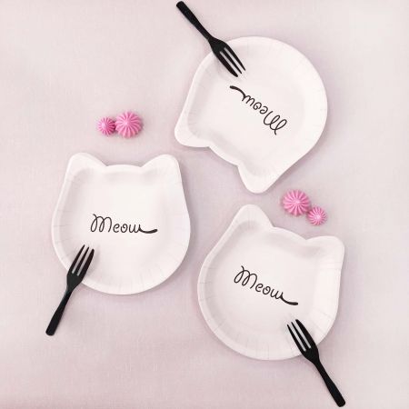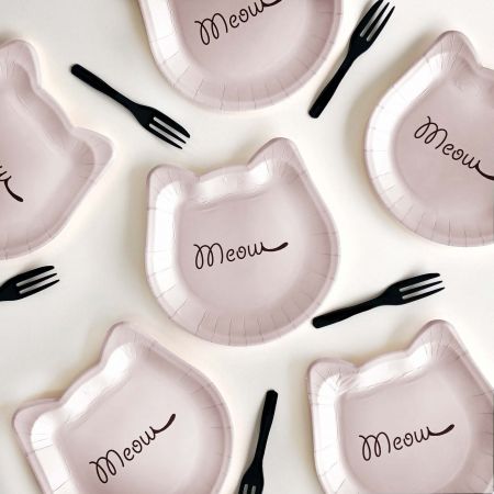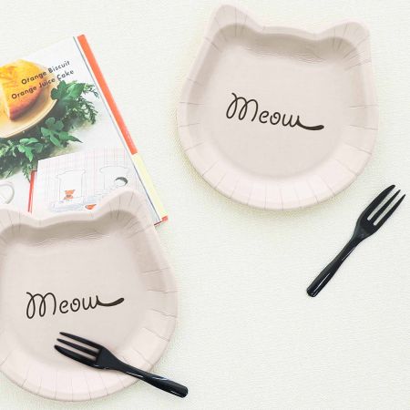 貓咪造型蛋糕盤叉組為6盤6叉,藕色的小貓蛋糕盤搭配10公分黑色法式蛋糕叉,盛裝三角蛋糕、奶凍捲都沒問題!紙盤上還有超可愛的meow字樣及貓咪尾巴喔!一箱100套。