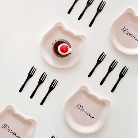 - 內容物:黑色法式蛋糕叉+藕色貓咪盤(一組各6入)