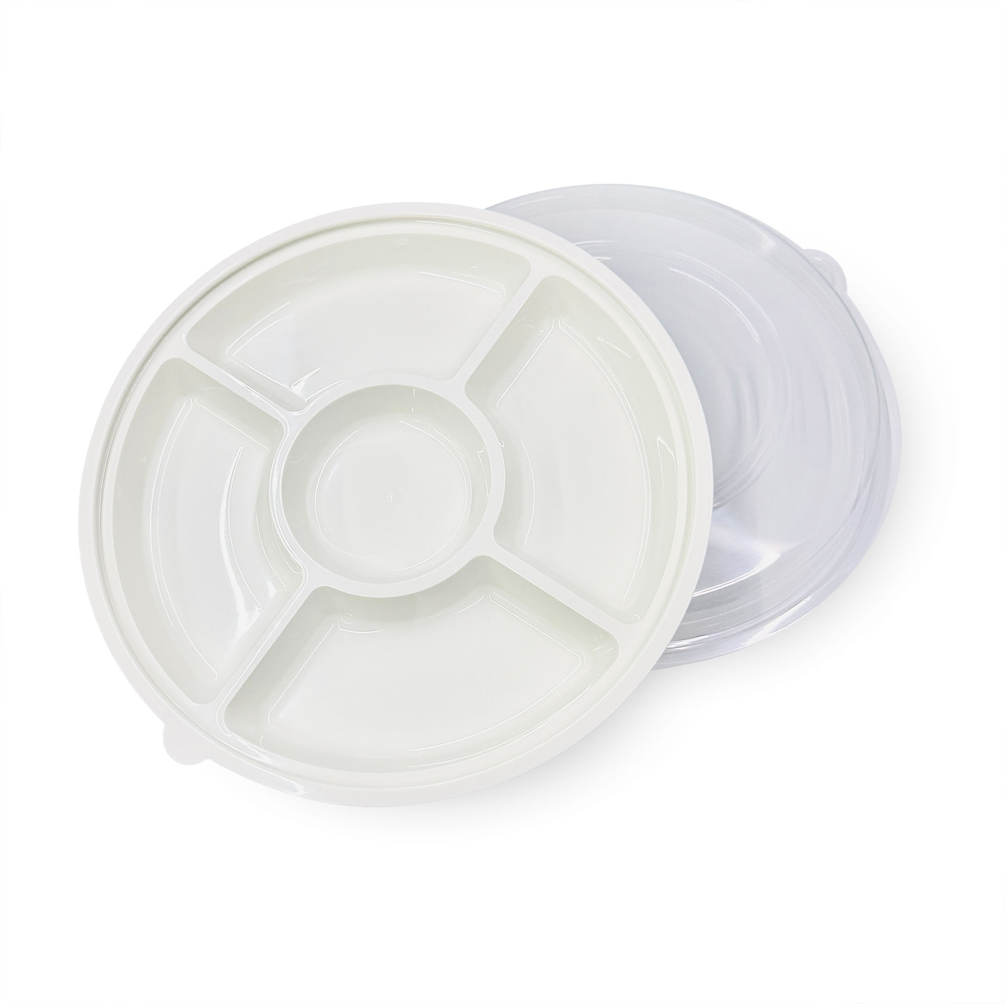 可微波13吋五格盤五格大容量適合五福臨門年菜組合,分隔冷盤拼盤、壽司滷味或米糕,直接微波加熱。五格分隔讓年菜組合端上桌美觀整齊,直徑32.7x6.3cm,100組出貨,理想年節外帶或外燴宴會分享。 苔曙是台灣專業製造可微波13吋五格盤及提供塑膠免洗餐具及客製化塑膠製品設計生產服務的優良廠商(成立於西元1978年)擁有超過三十五年以上的產品開發及製造經驗,苔曙在食品包裝,無論是拋棄式餐具,餐盒、杯子或者是各式各樣的客製化產品之外,同時也提供自行開發設計的TC餐具。.