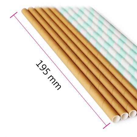 牛皮色紙吸管是單色設計,也更好搭配在飲料杯上,適合冰咖啡、茶飲、果汁使用。紙吸管是平口設計,無塑膠淋膜,長度為195mm,口徑6mm,厚度320gsm。